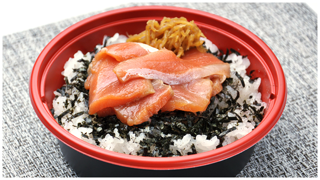 脂ののったサーモントラウトのお刺身を生姜をきかせた醤油ダレに漬け、お召し上がり易いサイズのお弁当にいたしました。
