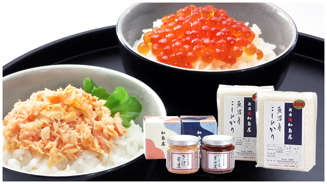 【新米 魚沼産こしひかり1㎏入×2、さけ茶漬 中B、いくら醤油漬中B】