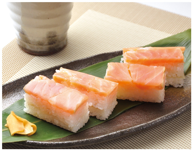 脂ののったキングサーモン、昆布、魚沼産こしひかりで作る加島屋特製、季節限定の押し寿司です。