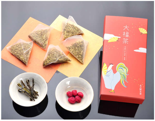 梅干しと昆布が入った慶びのお茶に旧年の邪気払いと、新年の無病息災の願いを込めて頂く縁起茶をご用意しました。