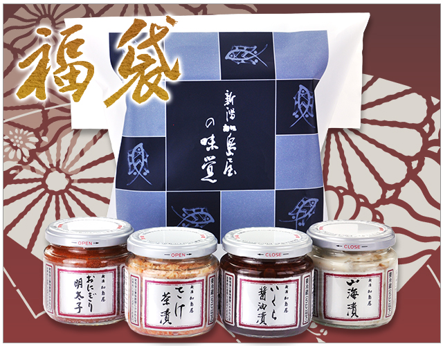 人気の瓶詰4品を中ビンにて詰め合わせた加島屋オリジナルの「福袋」を1月1日(元旦)~3日(水)お正月三が日限定のスペシャルプライスで販売いたします。お届け先1件につき1個までとなり、発送期間も1月2日(火)~5日(金)までの期間限定となります。