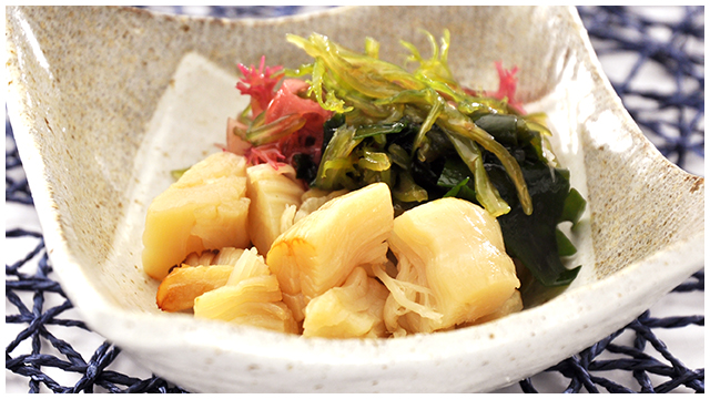 北海道産の大粒帆立を照り焼きにして粗くほぐし、甘めのだしで味付けした海藻を添えました。