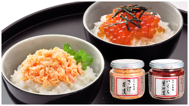 人気商品の「さけ茶漬」「いくら醤油漬」の 中瓶2本を