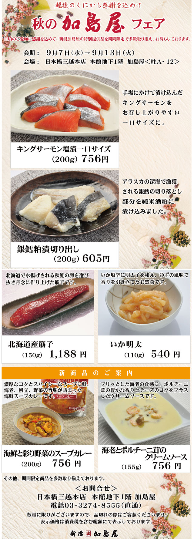 日頃の感謝を込め 日本橋三越本店 にて「秋の加島屋フェア」を開催いたします。