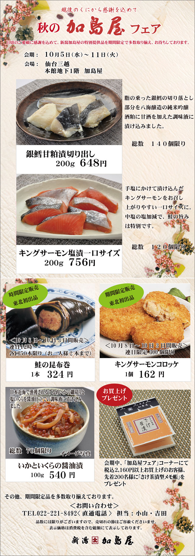 日頃の感謝を込め 仙台三越 にて「秋の加島屋フェア」を開催いたします。