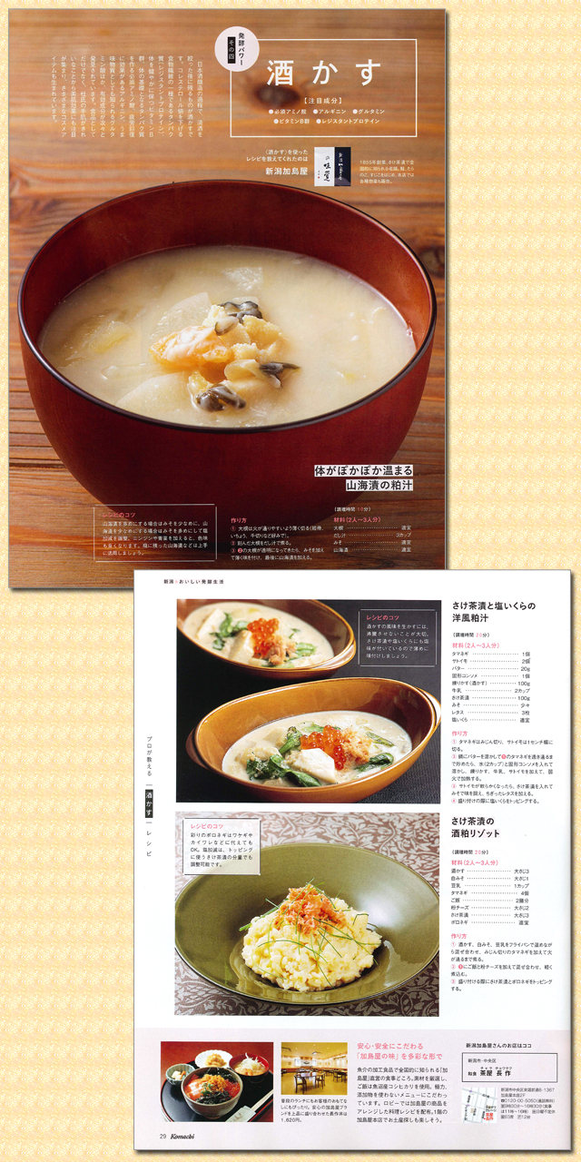 新潟の情報雑誌 Komachi(コマチ)3月号 2017年1月25日(水)発行 490円(税込) 「新潟 おいしい発酵生活」のコーナー “プロが教える「酒粕」レシピ”で 加島屋の商品を使ったお料理レシピが紹介されました。