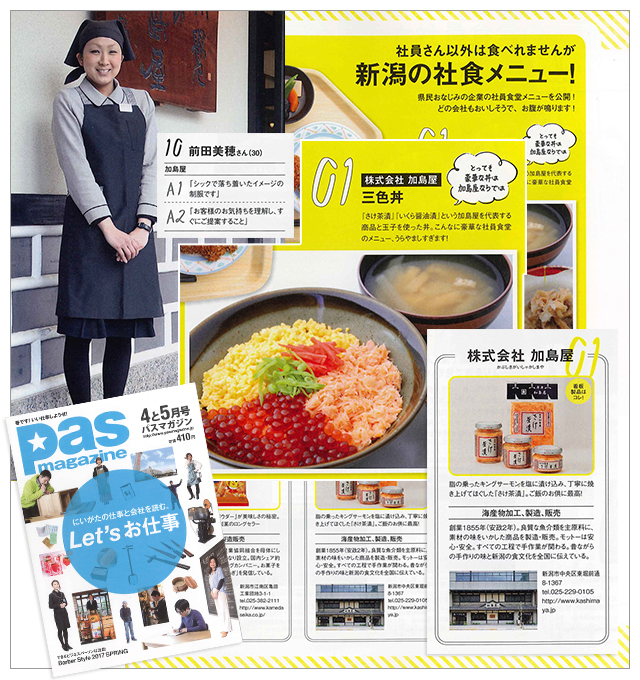 新潟の情報雑誌「Pas magazine(パスマガジン)4と5月号」 2017年3月28日(火)発行 410円(税込) 「新潟のすご~い会社」のコーナーで 加島屋の社食メニューと社員インタビュー記事が紹介されました。