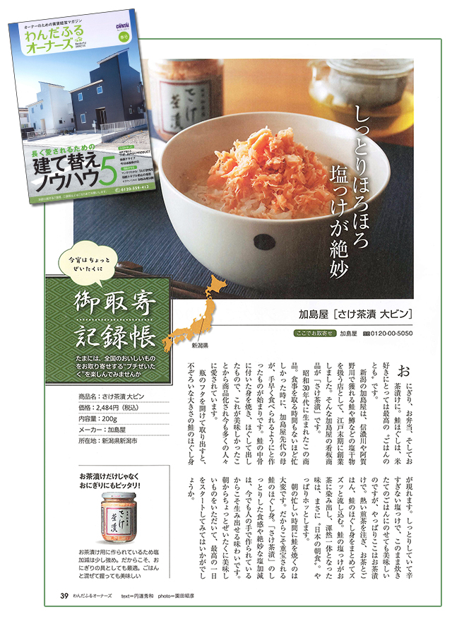 株式会社CHINTAI 発行 わんだふるオーナーズ 2017年4月20日(木)発行 2017春号 全国の賃貸経営者向けの専門冊子「わんだふるオーナーズ」の “御取寄記録帳”のコーナーで加島屋のさけ茶漬が紹介されました。