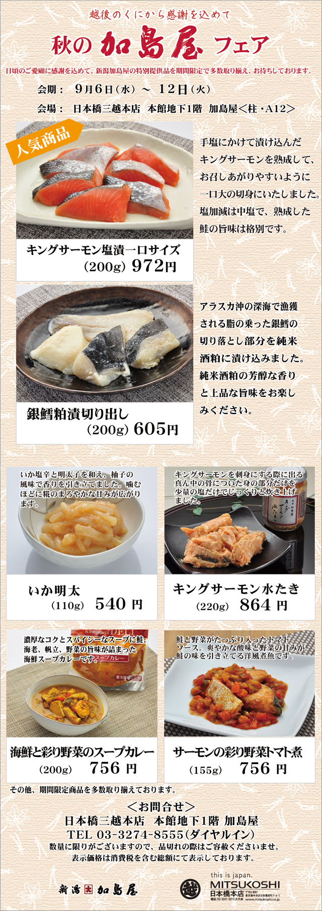 日頃の感謝を込め 日本橋三越本店 にて「秋の加島屋フェア」を開催いたします。