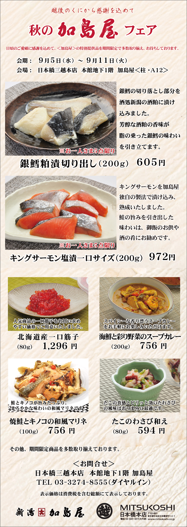 日頃の感謝を込め、日本橋三越本店にて「秋の加島屋フェア」を開催いたします。