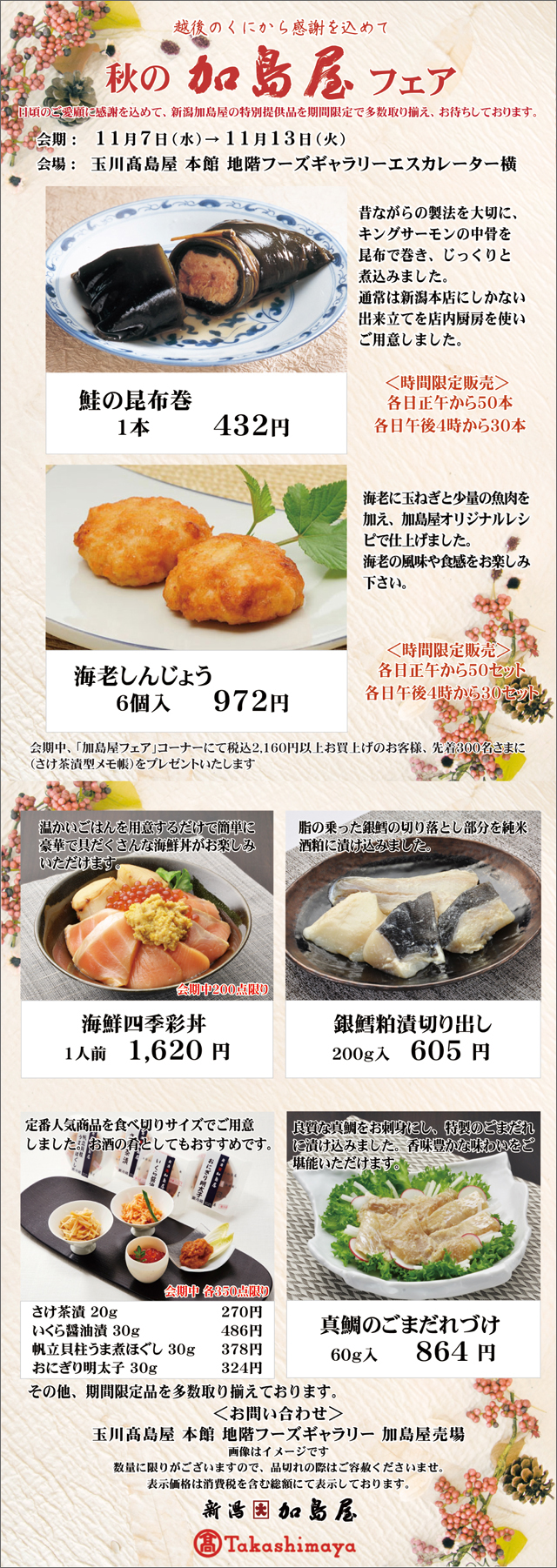 日頃の感謝を込め、髙島屋玉川店にて「秋の加島屋フェア」を開催いたします。