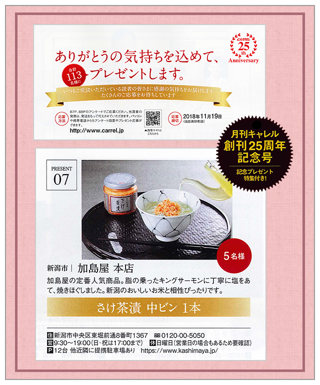 創刊25周年記念で加島屋の「さけ茶漬」がプレゼントで掲載されました。