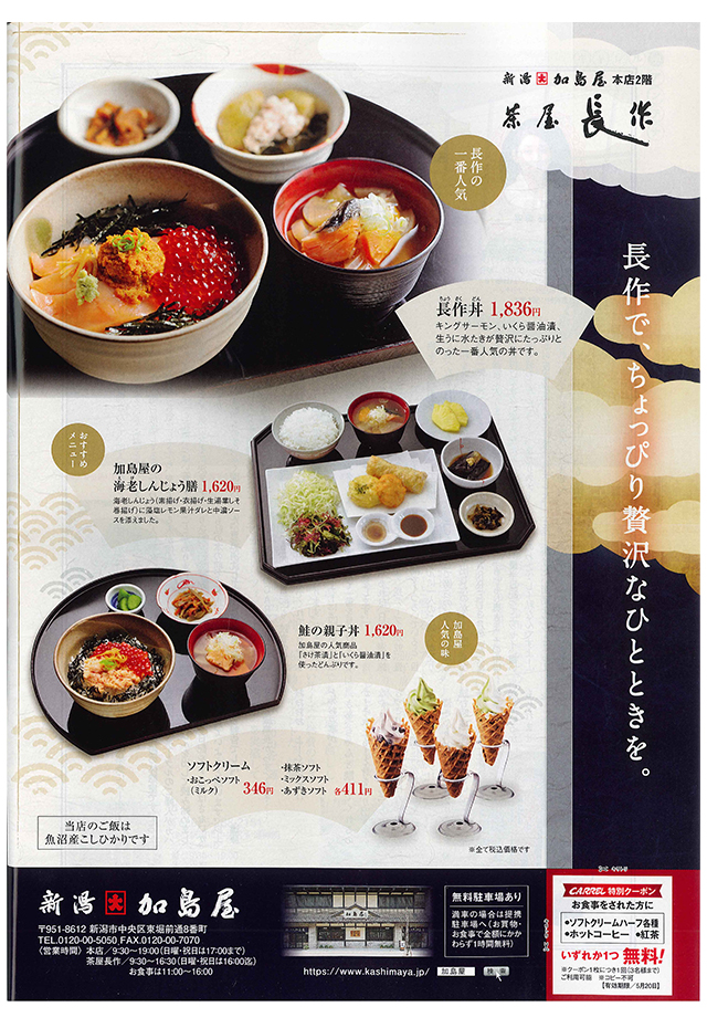 新潟の情報雑誌CARREL(キャレル) 2019.5月号 2019年4月20日(土)発売 432円(税込) 茶屋長作の人気メニューやおすすめメニューを紹介しました。 特別クーポン券も付いていますので、是非ご利用ください。
