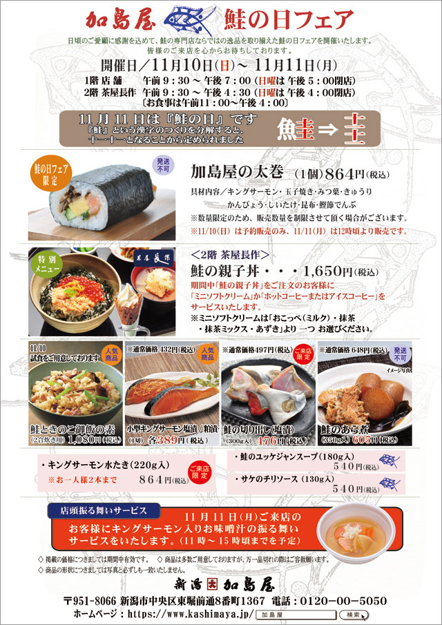 11月11日(月)は、本店にて「キングサーモン入り味噌汁」の振るまいサービスがあります。