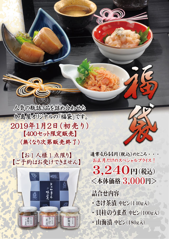 人気の瓶詰4品を中ビンにて詰め合わせた加島屋オリジナルの「福袋」です。