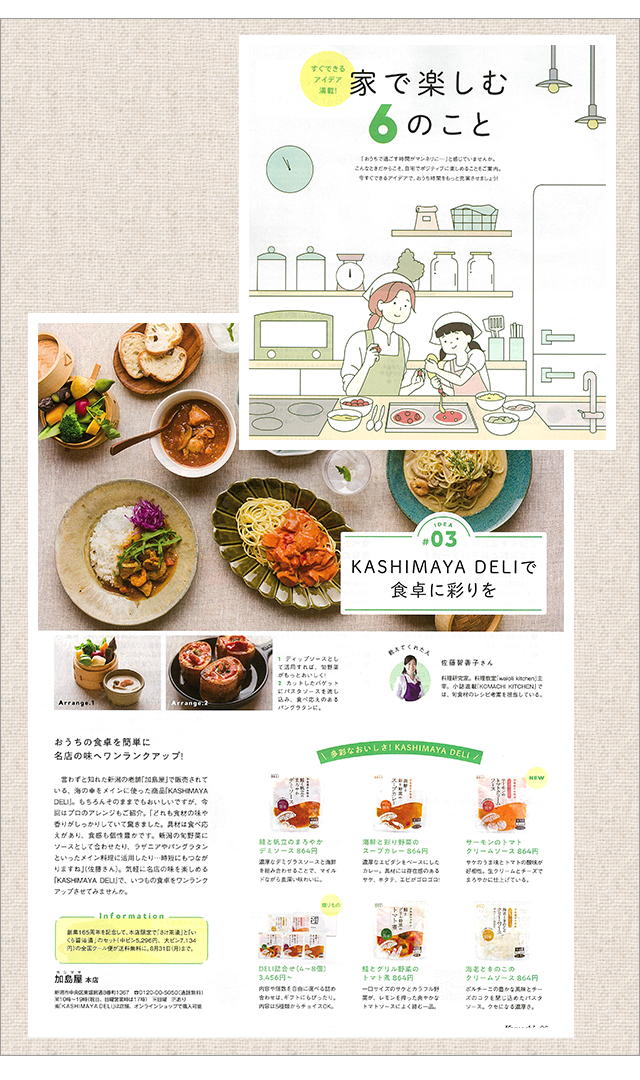 新潟の情報雑誌「komachi(コマチ)」2020年8月号 2020年6月25日(木)発売 499円(税込) KASHIMAYA DELI商品を使ったアレンジ料理を 料理研究家 佐藤 智香子さんよりご紹介していただきました。