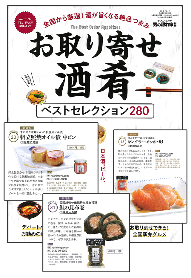雑誌「男の隠れ家 別冊」 2020年8月19日(水)発売 1000円(本体価格) 「お取り寄せ酒肴 ベストセレクション280」で 加島屋の「帆立照焼オイル漬・鮭の昆布巻・キングサーモンのづけ」をご紹介していただきました。