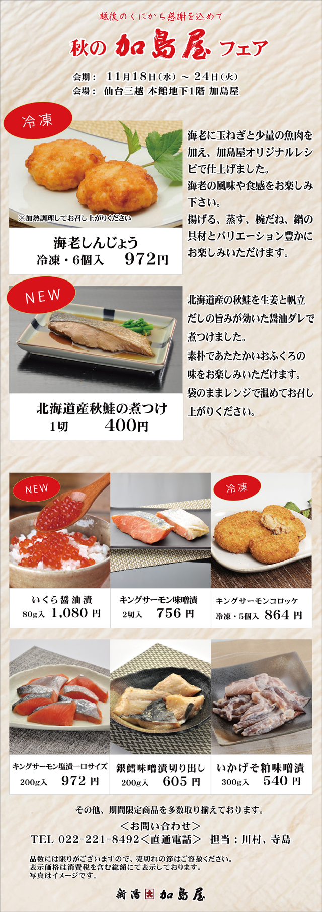 日頃の感謝を込め、仙台三越にて「秋の加島屋フェア」を開催いたします。