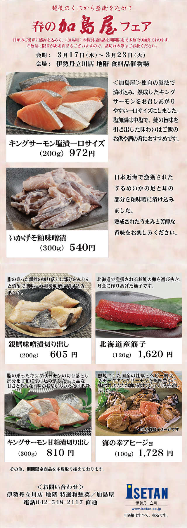 日頃の感謝を込め、伊勢丹立川店にて「春の加島屋フェア」を開催いたします。