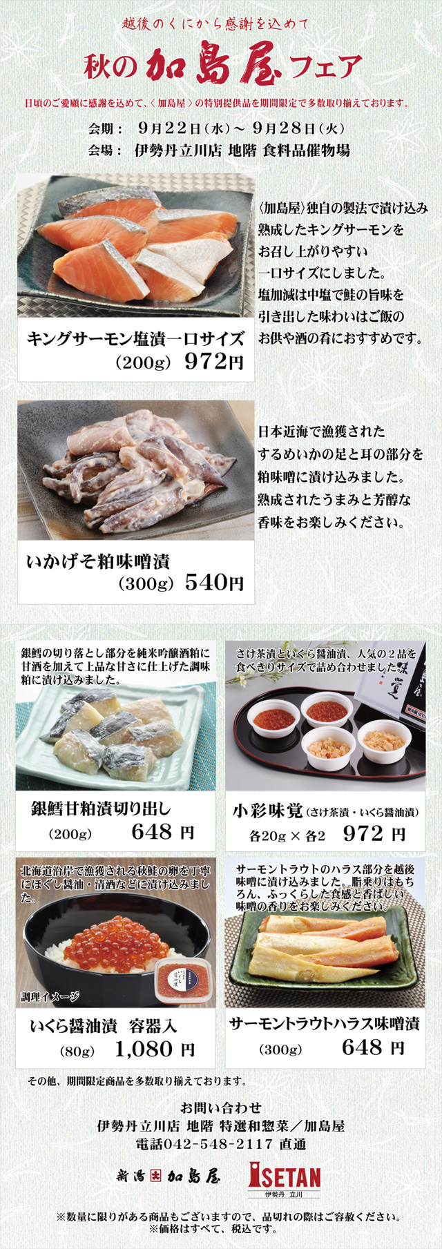 日頃の感謝を込め、伊勢丹立川店にて「秋の加島屋フェア」を開催いたします。