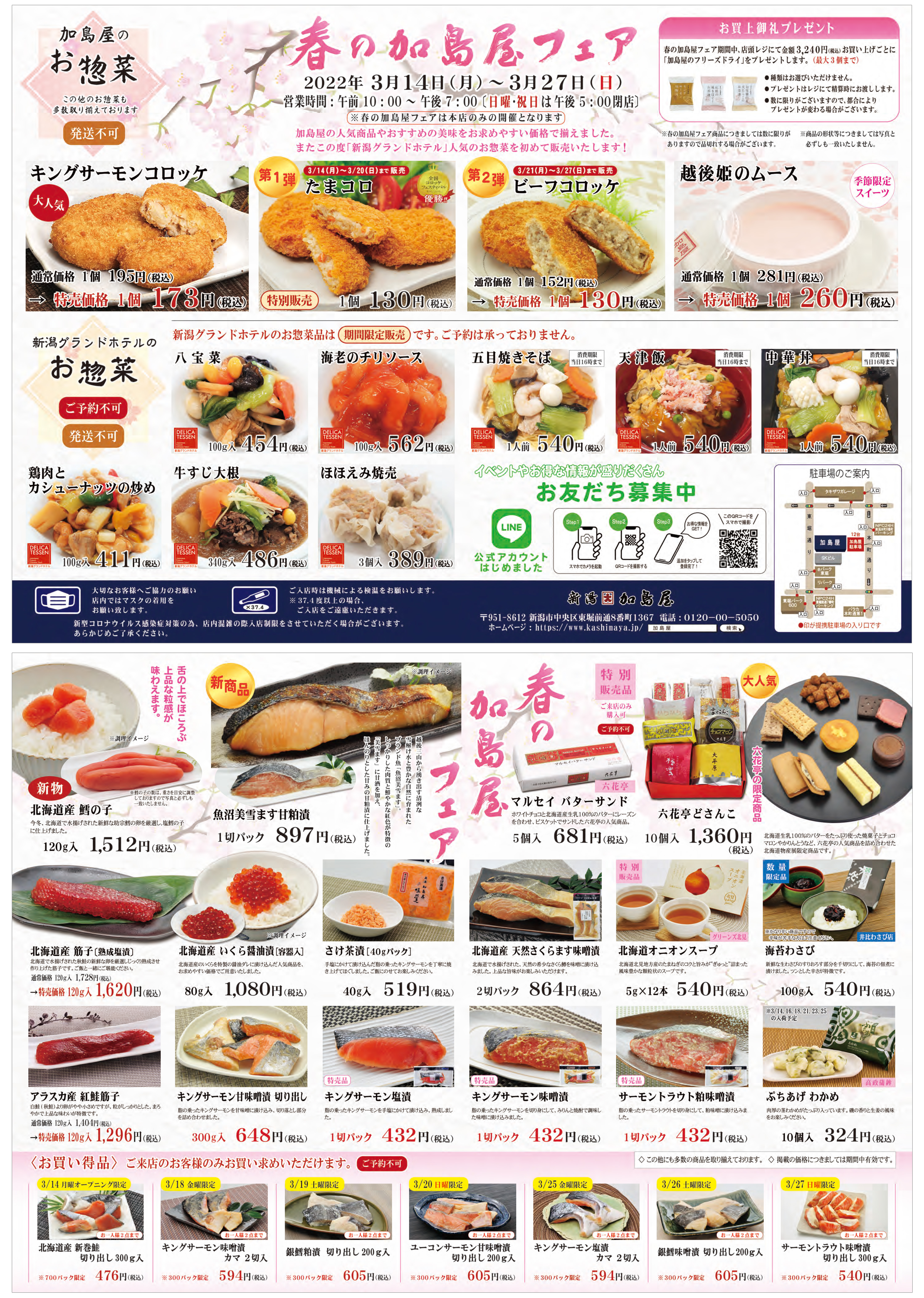 日頃のご愛顧に感謝を込め「春の加島屋フェア」を開催いたします。 人気の商品やおすすめの美味を揃えました。 またこの度「新潟グランドホテル」人気のお惣菜を初めて販売いたします! 皆様のお越しを心よりお待ちしております。