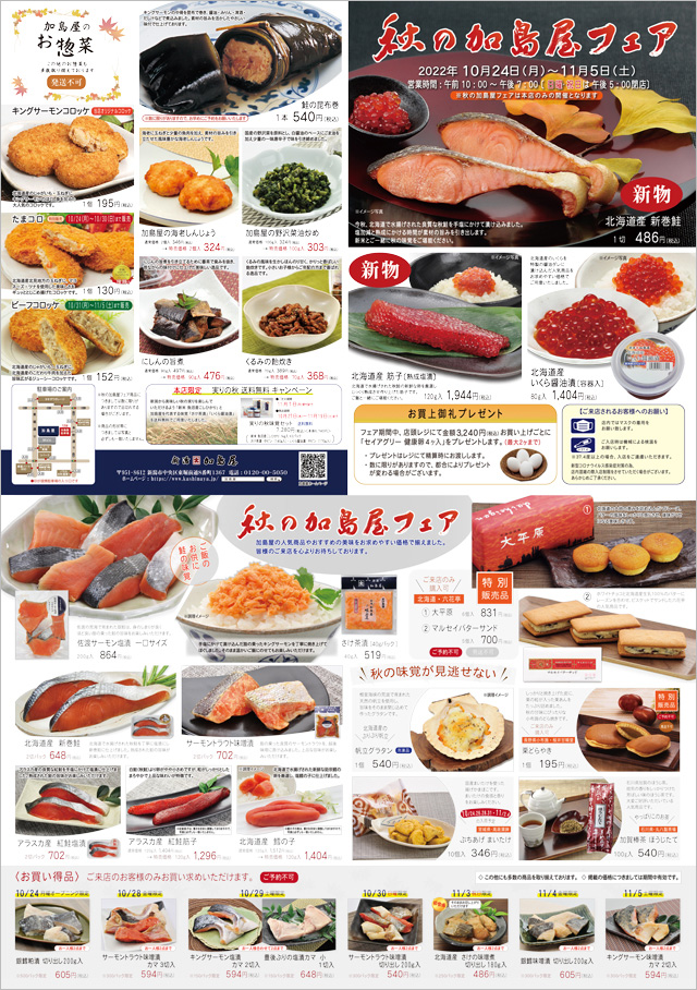 日頃のご愛顧に感謝を込めて「秋の加島屋フェア」を開催いたします。 新巻鮭・筋子などの新物や人気の商品やおすすめの美味を揃えました。 皆様のお越しを心よりお待ちしております。 開催期間:2022年10月24日(月曜日)~11月5日(土曜日) 営業時間:午前10時~午後7時(日曜は午後5時閉店) ※「秋の加島屋フェア」は本店のみの開催となります。