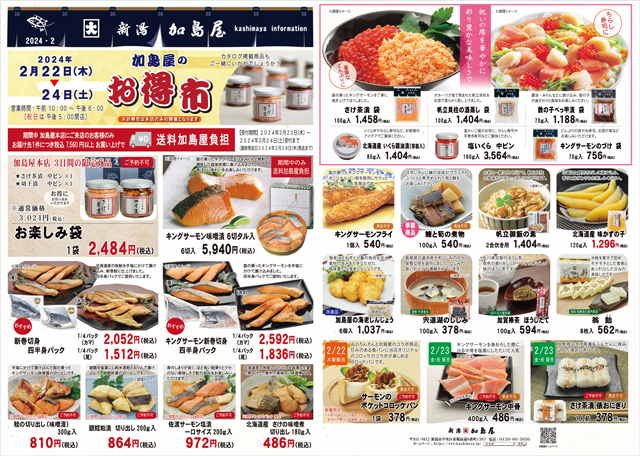 日頃のご愛顧に感謝を込め「加島屋のお得市」を開催いたします。 人気お惣菜品などを特別価格にてご提供いたします。 是非、この機会にご利用ください。 皆様のお越しを心よりお待ちしております。 開催期間:2024年2月22日(木)~ 2月24日(土) ※ 加島屋のお得市は本店のみの開催となります。 ※ 一部商品はネットショップでご購入いただけます。