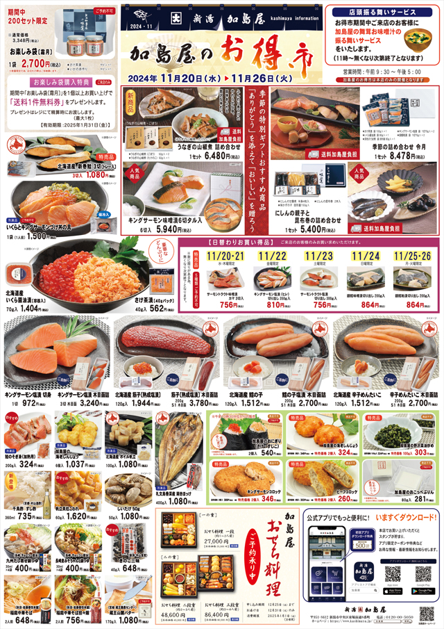 日頃のご愛顧に感謝を込め「加島屋のお得市」を開催いたします。 人気お惣菜品などを特別価格にてご提供いたします。 是非、この機会にご利用ください。 皆様のお越しを心よりお待ちしております。 開催期間:2024年11月20日(水)~ 11月26日(火) ※ 加島屋のお得市は本店のみの開催となります。 ※ 一部商品はネットショップでご購入いただけます。