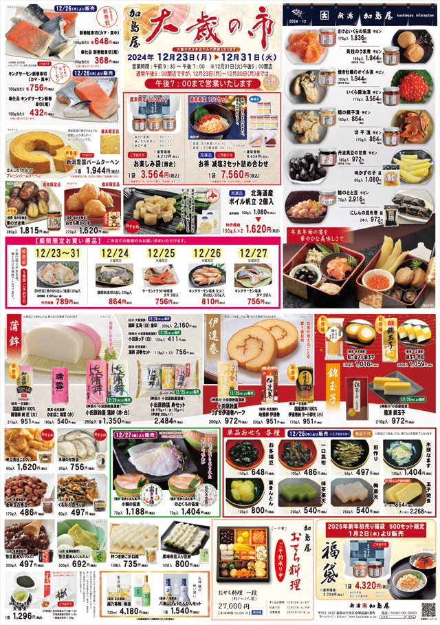 開催期間:2024年12月23日(月曜日)~ 12月31日(火曜日) 営業時間:午前9:30 ~ 午後7:00(12/31:午後5時まで) ※ 大歳の市は本店のみの開催となります。