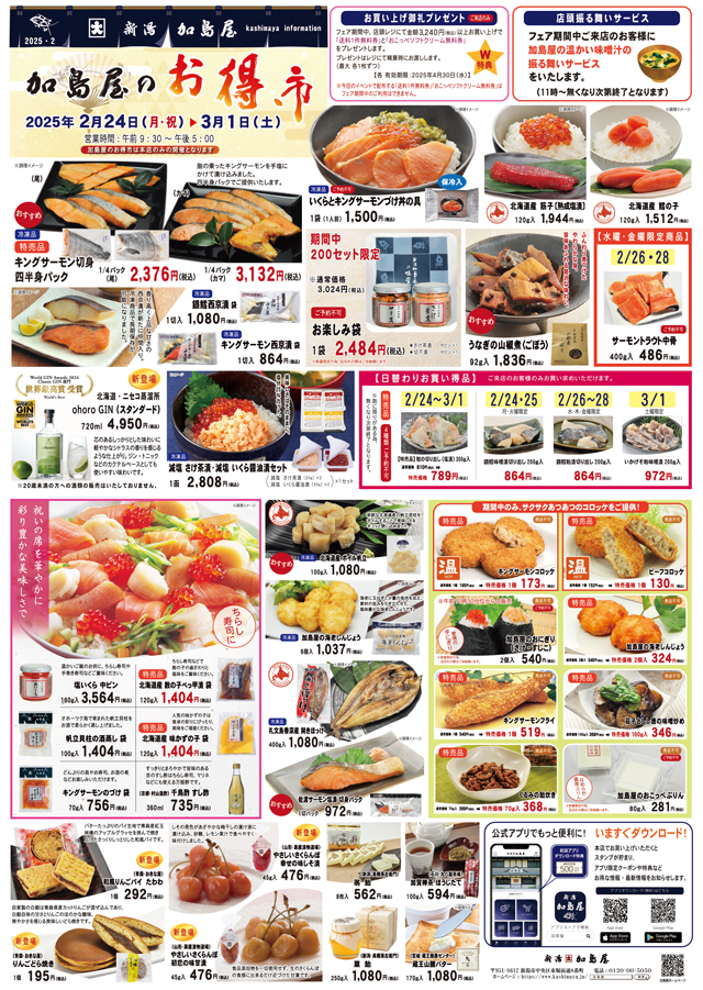 日頃のご愛顧に感謝を込め「加島屋のお得市」を開催いたします。 人気お惣菜品などを特別価格にてご提供いたします。 是非、この機会にご利用ください。 皆様のお越しを心よりお待ちしております。 開催期間:2025年2月24日(月・祝)~ 3月1日(土) ※ 加島屋のお得市は本店のみの開催となります。