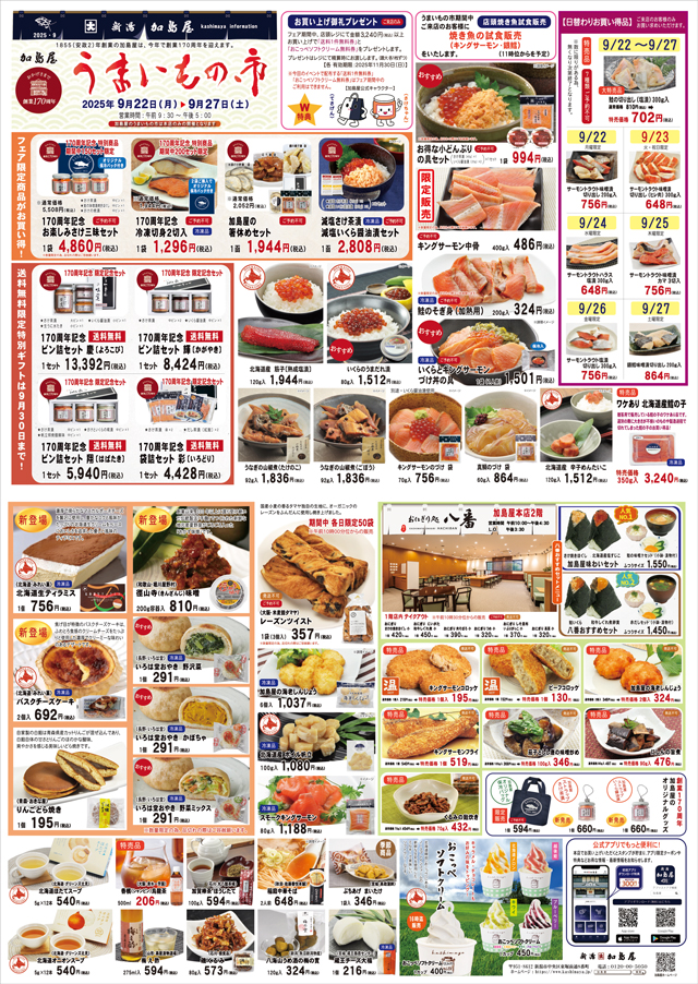 日頃のご愛顧に感謝を込め「加島屋のうまいもの市」を開催いたします。 人気の商品やおすすめの美味を揃えました。 皆様のお越しを心よりお待ちしております。 開催期間:2025年9月22日(月曜日)~ 9月27日(土曜日) 営業時間:午前9:30 ~ 午後5:00 ※ 加島屋のうまいもの市は本店のみの開催となります。