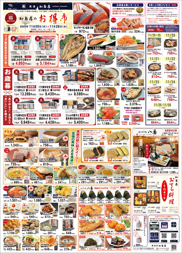 日頃のご愛顧に感謝を込め「加島屋のお得市」を開催いたします。 人気お惣菜品などを特別価格にてご提供いたします。 是非、この機会にご利用ください。 皆様のお越しを心よりお待ちしております。 開催期間:2025年11月20日(木)~ 11月26日(水) ※ 加島屋のお得市は本店のみの開催となります。 ※ 一部商品はネットショップでご購入いただけます。