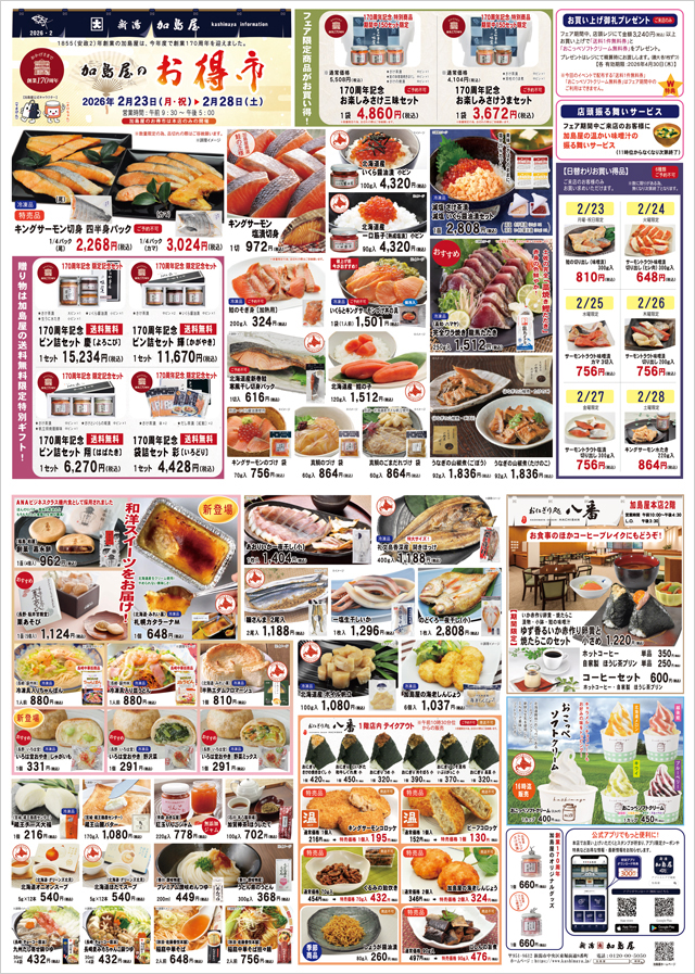 日頃のご愛顧に感謝を込め「加島屋のお得市」を開催いたします。 人気お惣菜品などを特別価格にてご提供いたします。 是非、この機会にご利用ください。 皆様のお越しを心よりお待ちしております。 開催期間:2026年2月23日(月・祝)~ 2月28日(土) ※ 加島屋のお得市は本店のみの開催となります。 ※ 一部商品はネットショップでご購入いただけます。