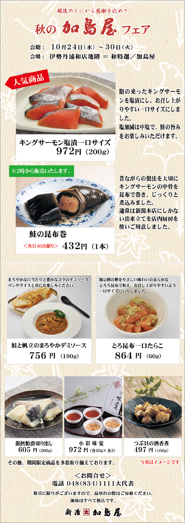 日頃の感謝を込め、伊勢丹浦和店にて「秋の加島屋フェア」を開催いたします。