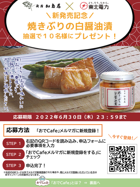 加島屋×東北電力「新発売記念!焼きぶりの白醤油漬」プレゼント企画を実施いたします。