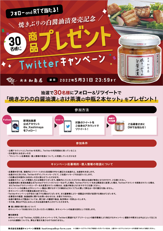 新潟加島屋Twitterにフォロー&リツイートしていただきますと