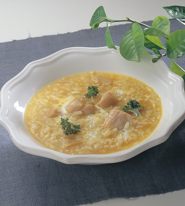 コンソメスープに缶詰の汁を加え、軽くほぐした帆立貝柱とごはんを入れかるく煮込みます。