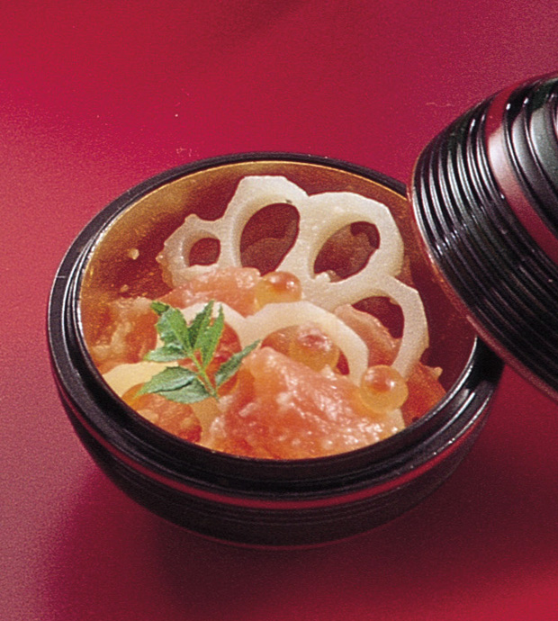 帆立貝柱の酒蒸しとさけの糀漬の旨みを箱寿司で味わいます。