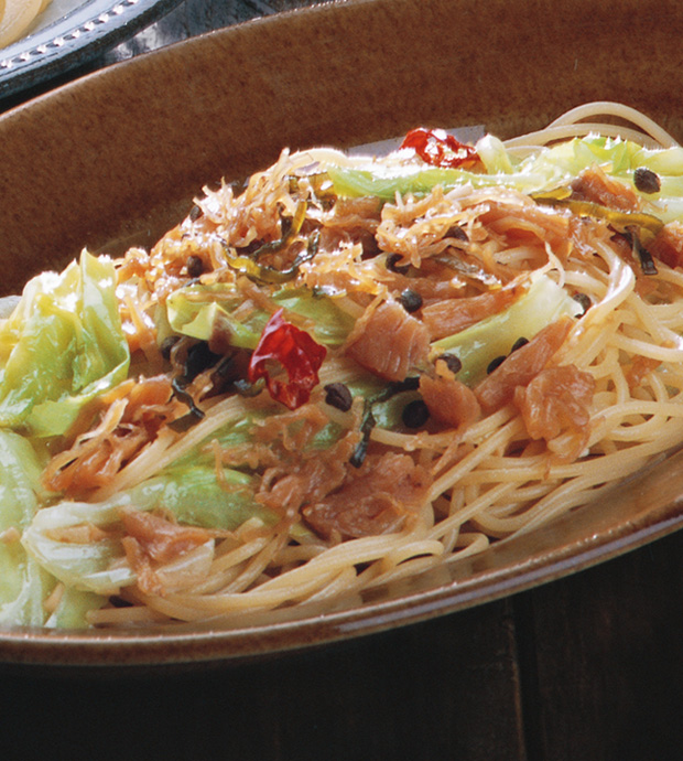 だし茶漬をパスタに。山椒が効いた帆立とだし汁をいかした和風パスタです。