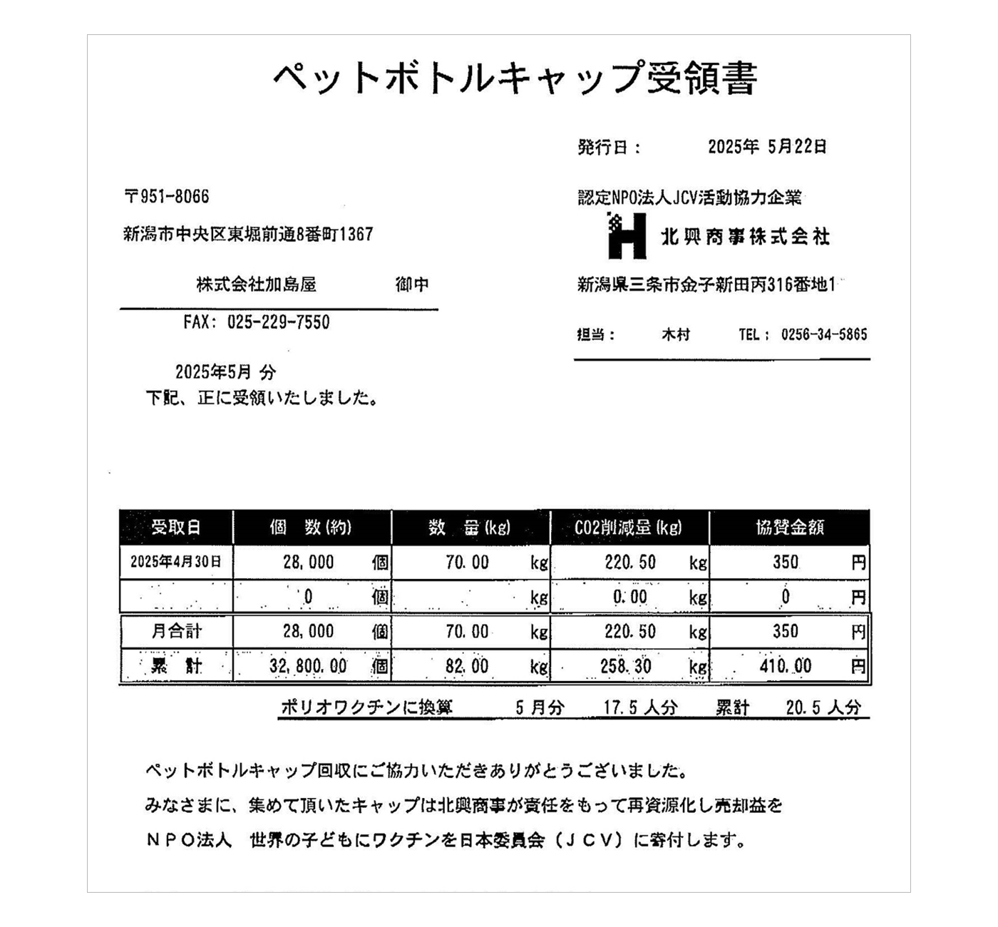 | 個数 | 28,000個 | CO2削減量 | 220.5kg | ワクチン | 17.5人分 |