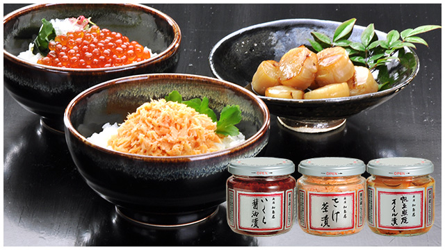 加島屋の人気商品「さけ茶漬」の中瓶3本を詰め合わせた「口福セット しわす」に、ご飯にのせるだけで手軽に贅沢な味わいをお楽しみいただける「加島屋のどんぶり」から新商品「うに・いくら丼」鮮やかな身色で程よい脂のりの「アラスカ産 紅鮭塩漬一口サイズ」他、ネットショップ限定ギフトやお歳暮におすすめの品などを、ご紹介させていただきます。