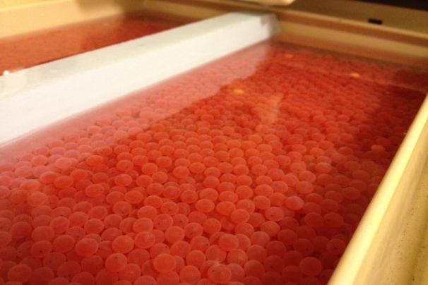 採算や効率を重視すると、品質が犠牲になってしまい、健康で美味い魚は育ちません。 私たちは、何よりも品質と安全を第一に優先し、試行錯誤を重ね、平成22年(2010年)頃からようやく『さけ茶漬』の原料として納得できるキングサーモンを育てられるようになりました。