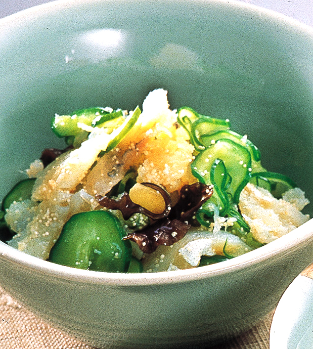 一塩生干しいかは細切り、にんにくはスライスしておきます。オリーブ油でにんにくを炒めて香りをだし、一塩生干しいかと赤とうがらしを軽く炒め茹でたスパゲッティをからめて、塩・コショウで味を調えます。