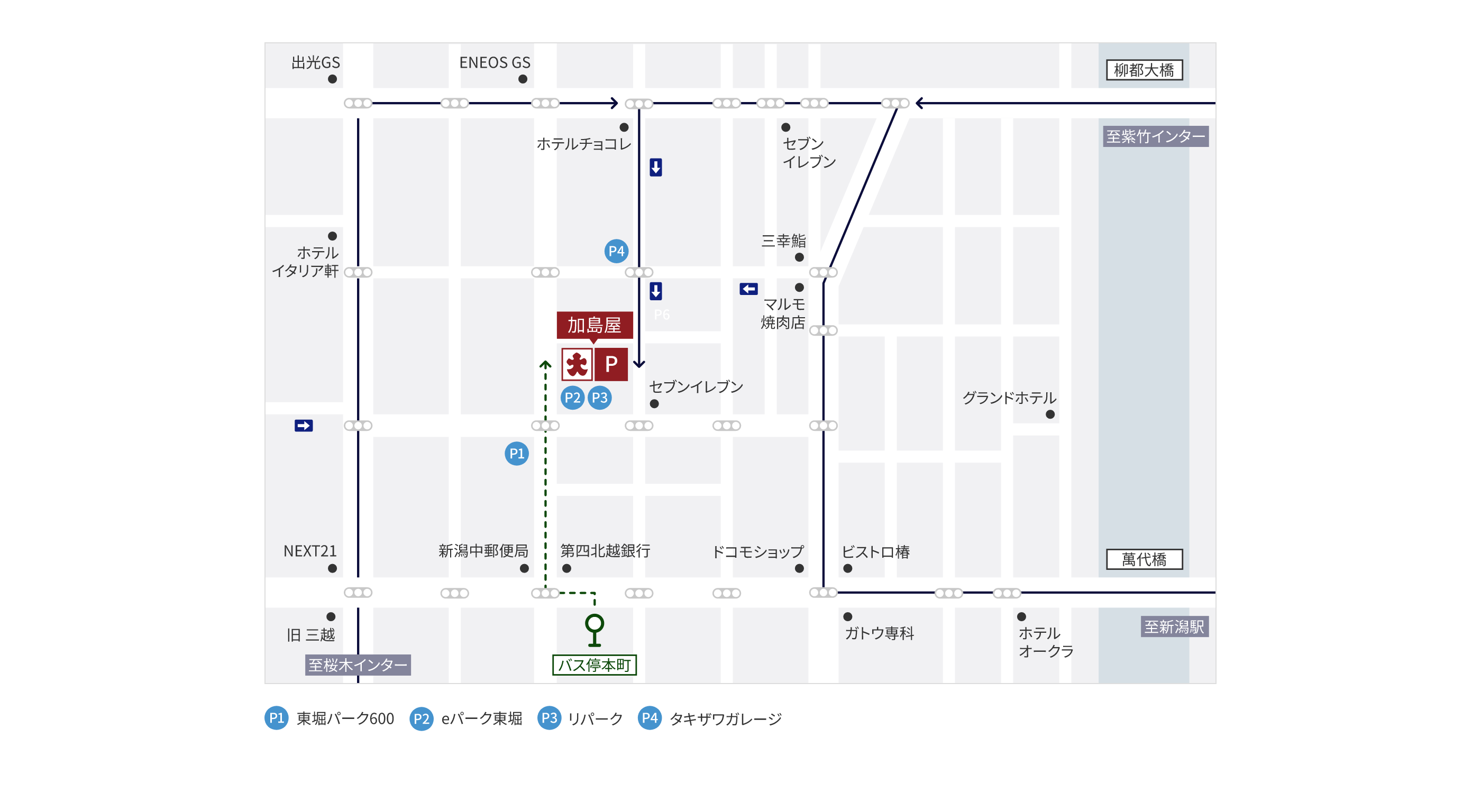 新潟駅より車で10分、古町・本町停留所より徒歩5分、新潟バイパス紫竹山I.C・桜木I.Cより車で15分